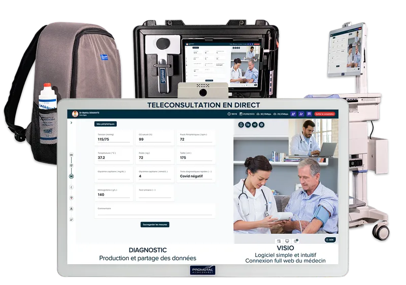 Mallette pour les visites à domicile et les CPTS. Chariot pour les salles de consultation fixes et les EHPAD. Sac à dos pour la mobilité maximale sur le terrain.